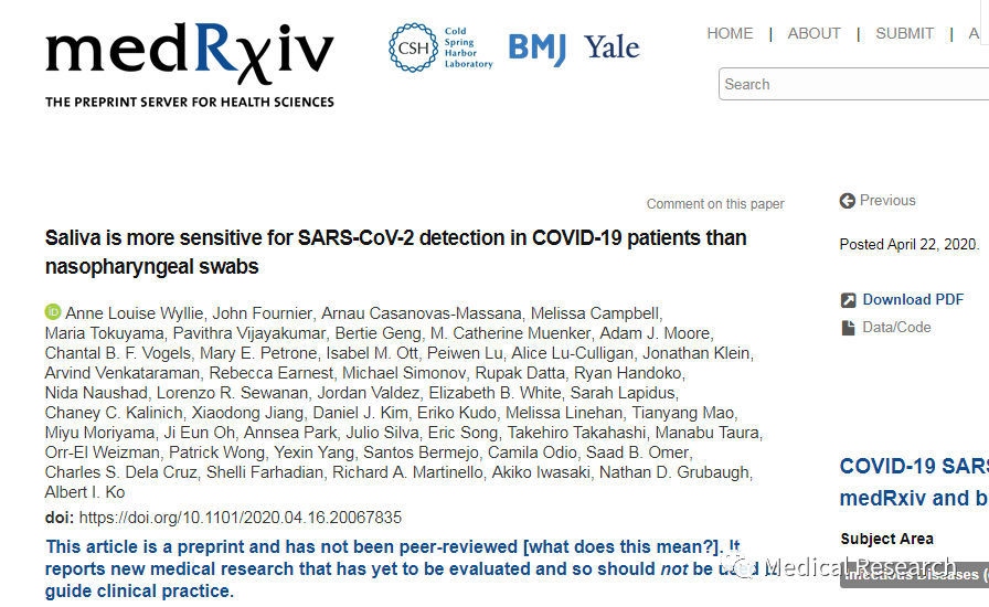 4月22日,耶鲁大学研究团队在预印本《medRxiv》上发表了题为“Saliva is more sensitive for SARS-CoV-2 detection in COVID-19 patients than nasopharyngeal swabs”的研究文章。