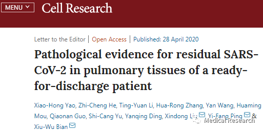 2020年4月28日,陆军军医大学及南方医科大学联手合作,卞修武、平轶芳及刘新东共同通讯在《Cell Research》在线发表题为“Pathological evidence for residual SARS-CoV-2 in pulmonary tissues of a ready-for-discharge patient”的研究文章。