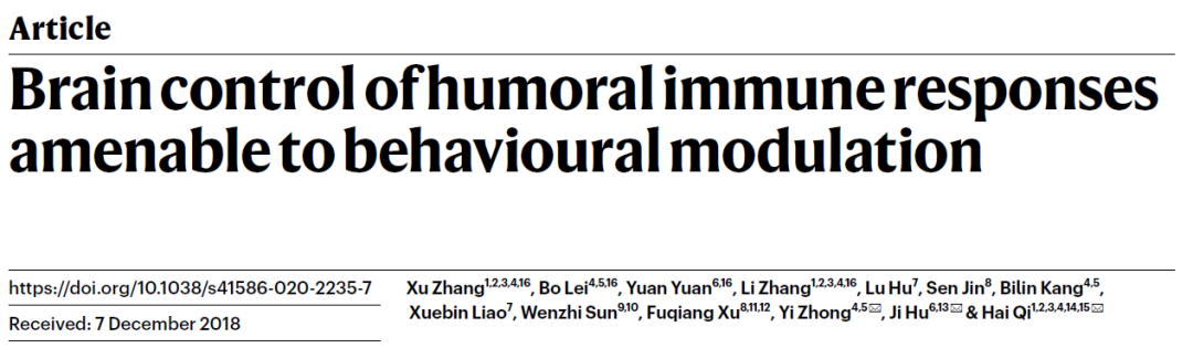 [5] Xu Zhang, et al., Brain control of humoral immune responses amenable to behavioural modulation. Nature. 2020.